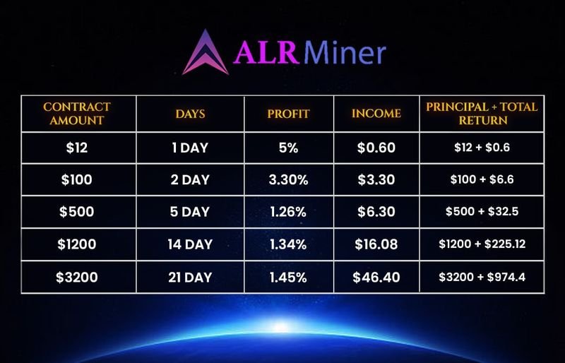 How to join Alr Miner:1: Sign up now to get a $12 bonus ($0.60 for daily check-ins).2: Choose a contract: After successfully registering, the next step is to choose a mining contract that suits your goals and budget. Alr Miner offers a variety of contracts to suit different needs, whether you are a beginner or an experienced miner. Take a close look at the available options, considering factors such as contract length, potential returns, and associated costs.3: Start Profiting: Once you have selected and activated your mining contract, you can sit back and let the system do the work for you. Alr Miner’s advanced technology ensures that your mining operation runs efficiently, maximizing your potential earnings.Choose the contract that suits your investment strategy: