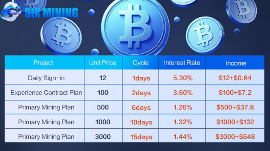 - 1. After registering as SIX MINING, you can get a $12 bonus. You can get $0.64 per day by using the trial funds to purchase trial contracts.