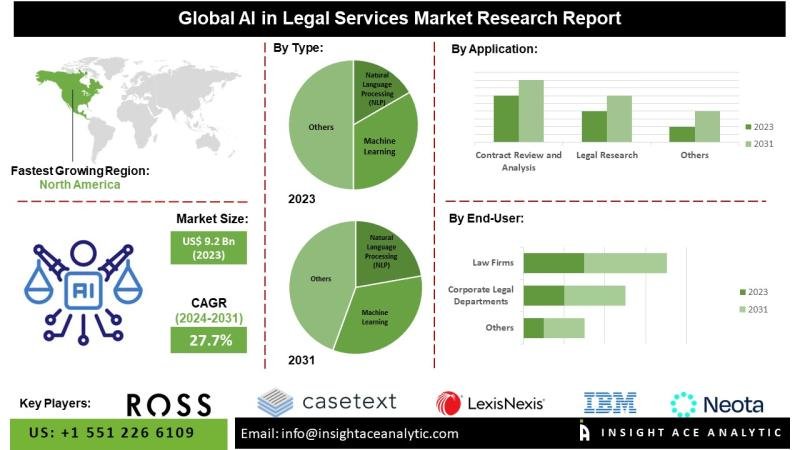 InsightAce Analytic Pvt. Ltd. announces the release of a market assessment report on the “Global AI in Legal Services Market – (By Type (Natural Language Processing (NLP), Machine Learning, Predictive Analytics, Data Analytics and Visualization, Robotic Process Automation (RPA), Virtual Assistants, Expert Systems), By Application (Contract Review and Analysis, Legal Research, E-Discovery and Litigation Support, Due Diligence, Predictive Legal Analytics, Compliance Management, Document Automation, Case Prediction and Outcome Analysis, Intellectual Property Management, Legal Chatbots), By End User (Law Firms, Corporate Legal Departments, Government and Regulatory Bodies, Legal Tech Companies, Others)), Trends, Industry Competition Analysis, Revenue and Forecast To 2031.”