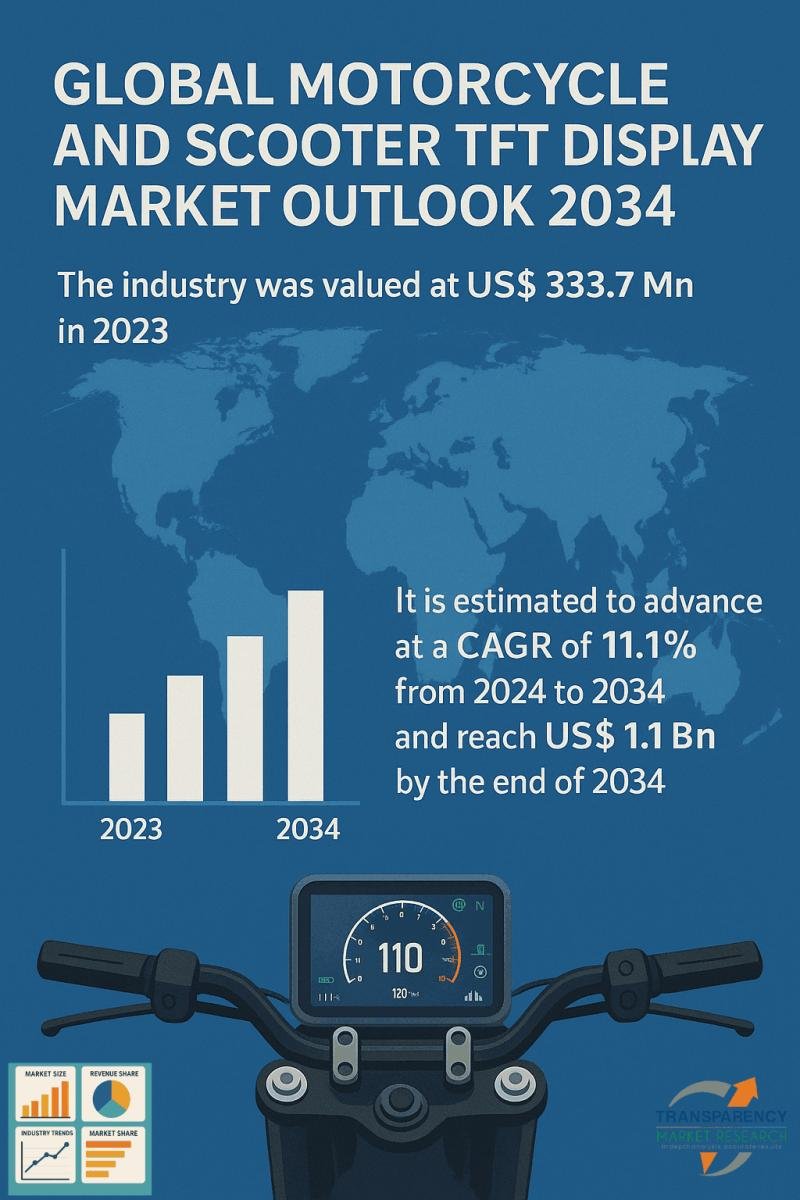 The global motorcycle and scooter TFT displays market was valued at US$ 333.7 Million in 2023 and is projected to reach US$ 1.1 Billion by 2034, growing at a CAGR of 11.1% from 2025 to 2034. Market expansion is fueled by rising demand for advanced digital dashboards and improved rider interface technologies.