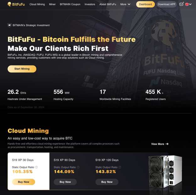 SINGAPORE, Dec. 02, 2024 (GLOBE NEWSWIRE) — BitFuFu Inc. (“BitFuFu” or the “Company”) (NASDAQ: FUFU), a global leader in Bitcoin mining and comprehensive mining services, providing customers with one-stop solutions including Cloud mining,today announced the launch of its upgraded website and mobile app, delivering a reimagined one-click digital asset mining experience. The enhanced platform features an intuitive, user interface, faster navigation, and improved access to BitFuFu’s products and services. These advancements reflect BitFuFu’s dedication to innovation and its commitment to empowering users with cutting-edge, user-friendly solutions tailored to their needs.