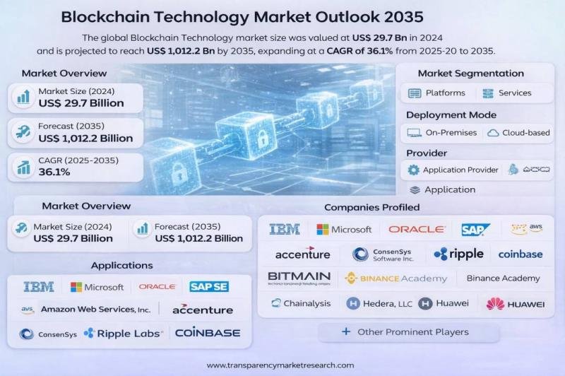 The global blockchain technology market was valued at US$ 29.7 billion in 2024 and is projected to surge to an impressive US$ 1,012.2 billion by 2035, registering a remarkable compound annual growth rate (CAGR) of 36.1% from 2025 to 2035. This exponential growth trajectory reflects the accelerating pace of enterprise blockchain adoption, increasing investments in decentralized applications (dApps), and the expanding role of blockchain in digital identity, payments, and asset tokenization. Governments and enterprises alike are allocating significant budgets toward blockchain integration as part of broader digital transformation initiatives, making the market one of the fastest-growing segments in the global technology landscape.