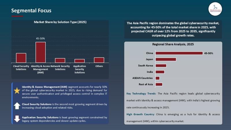 With 46% of global Cybersecurity Market share in 2025, Asia Pacific exceeds every other region in growth velocity. Revenue reaches USD 106.8 billion, powered by: