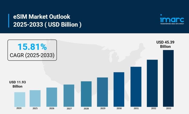 The global eSIM market size reached USD 11.9 Billion in 2024. Looking forward, IMARC Group estimates the market to reach USD 45.4 Billion by 2033, exhibiting a CAGR of 15.81% during 2025-2033. The market is experiencing unprecedented growth driven by the rapid expansion of IoT ecosystems, increasing smartphone penetration, growing adoption of connected vehicles, and the rising demand for seamless connectivity solutions across multiple devices and networks.