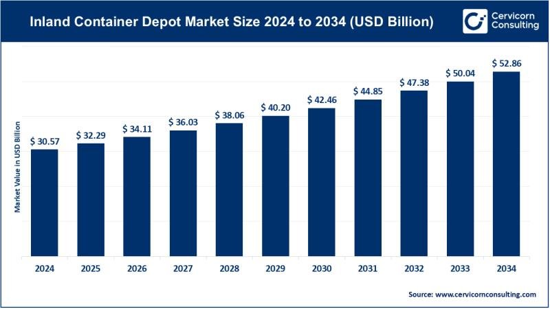 According to industry analysis, the inland container depot market size was valued at USD 30.57 billion in 2024 and is projected to reach USD 52.86 billion by 2034, growing at a compound annual growth rate (CAGR) of 5.63% from 2025 to 2034, driven by rising international trade, expanding e-commerce activities, and increasing investments in logistics infrastructure. The growing need for efficient multimodal transportation systems is a key factor supporting inland container depot market growth.
