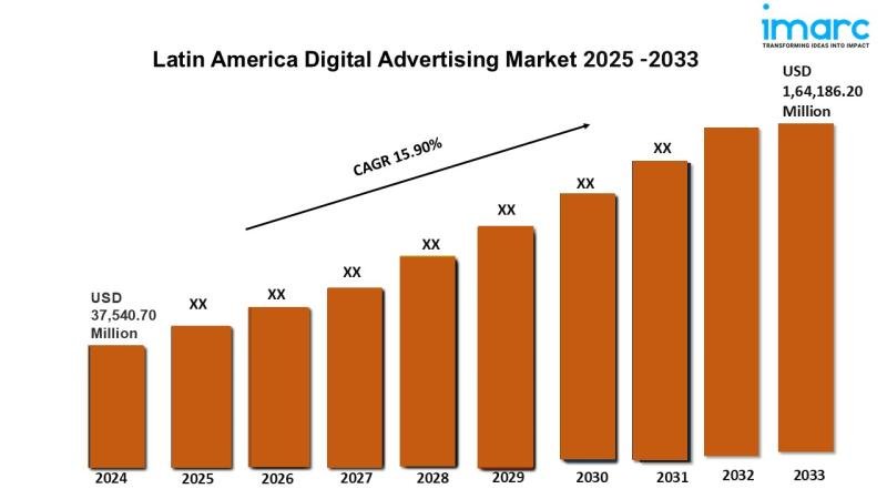 The Latin America digital advertising market size reached USD 37,540.70 Million in 2024. Looking forward, IMARC Group expects the market to reach USD 1,64,186.20 Million by 2033, exhibiting a growth rate (CAGR) of 15.90% during 2025-2033.