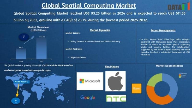 The spatial computing market reached US$ 93.25 billion in 2024 and is expected to reach US$ 511.55 billion by 2032, growing at a CAGR of 23.7% during the forecast period 2025-2032. The market is expanding rapidly due to rising adoption of immersive technologies such as augmented reality (AR), virtual reality (VR), mixed reality (MR), and advanced 3D sensing across industries including gaming, healthcare, manufacturing, retail, and education. These technologies enable seamless interaction between digital and physical environments, enhancing visualization, collaboration, and real-time decision-making.