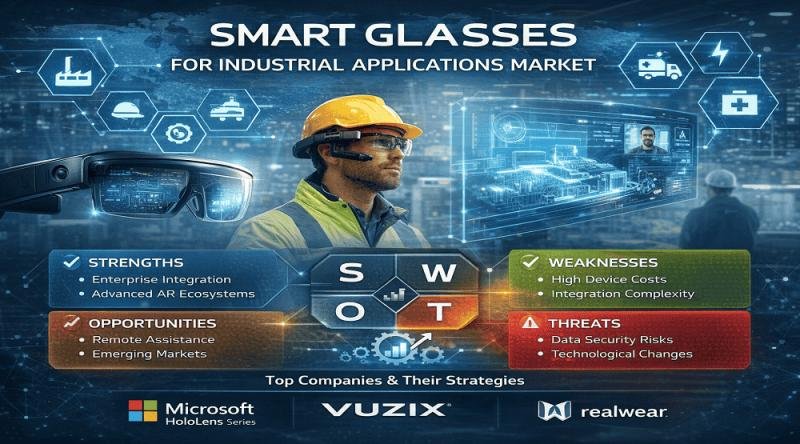 The Smart Glasses for Industrial Applications Market is rapidly transforming how enterprises approach frontline operations, maintenance, training, and remote collaboration. Designed to deliver real-time data overlays, guided workflows, and hands-free communication, smart glasses are becoming integral to Industry 4.0 initiatives. Adoption is accelerating across manufacturing, energy, logistics, healthcare, construction, and defense, as organizations prioritize productivity, worker safety, and operational continuity. This article analyzes the competitive landscape, evaluates leading companies through SWOT analysis, and highlights investment opportunities shaping the market’s evolution.