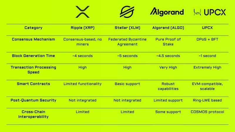 When compared to other blockchain payment solutions, UPCX presents several unique advantages over established platforms like Ripple (XRP), Stellar (XLM), and Algorand (ALGO):
