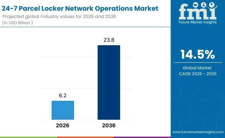 The 24-7 parcel locker network operations market is rapidly transitioning from a convenience-led delivery enhancement into a mission-critical layer of modern logistics infrastructure. Valued at USD 6.2 billion in 2026 and projected to reach USD 23.8 billion by 2036, the market is expanding at a robust CAGR of 14.5%, reflecting structural shifts in how parcels are delivered, secured, and collected across urban and suburban environments.