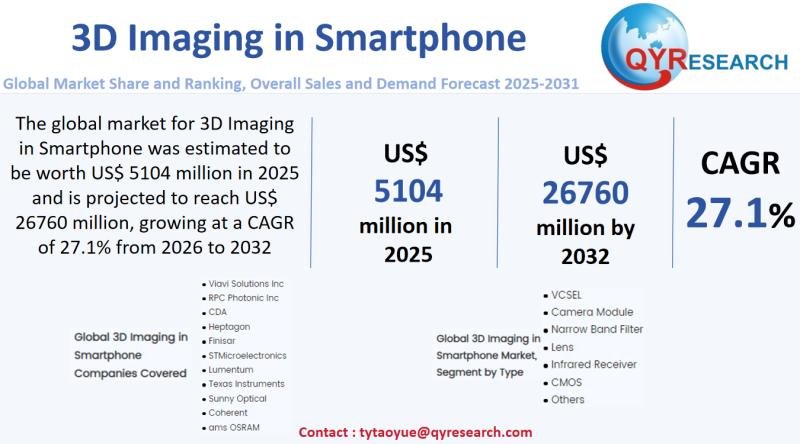 The global market for 3D Imaging in Smartphone was estimated to be worth US$ 5104 million in 2025 and is projected to reach US$ 26760 million, growing at a CAGR of 27.1% from 2026 to 2032.