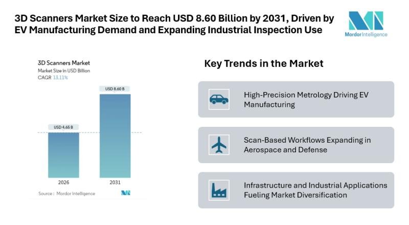 According to Mordor Intelligence, the 3D scanners market reached a value of USD 4.65 billion in 2026 and is projected to grow to USD 8.60 billion by 2031, registering a CAGR of 13.11% over the forecast period. This growth is supported by consistent adoption across manufacturing, healthcare, construction, and aerospace sectors, reinforcing a strong 3D scanner market forecast shaped by the need for tighter tolerances, traceable quality records, and faster product validation cycles.