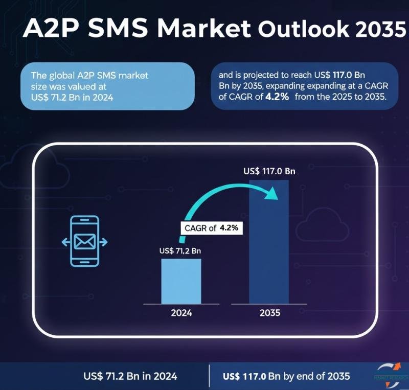 The global Application-to-Person (A2P) SMS market is entering a phase of steady and resilient expansion, driven by the growing need for secure, reliable, and real-time communication between enterprises and consumers. Valued at US$ 71.2 Bn in 2024, the market is projected to reach US$ 117.0 Bn by 2035, expanding at a CAGR of 4.2% from 2025 to 2035. Despite the rise of internet-based messaging platforms, A2P SMS continues to maintain its strategic relevance due to its universal reach, high open rates, and critical role in authentication, alerts, and transactional messaging.
