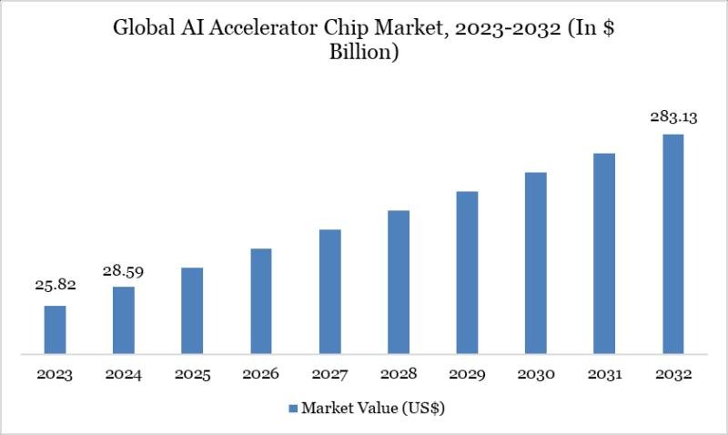 As per DataM intelligence research report “Global AI Accelerator Chip Market reached US$ 28.59 billion in 2024 and is expected to reach US$ 283.13 billion by 2032, growing with a CAGR of 33.19% during the forecast period 2025-2032.”