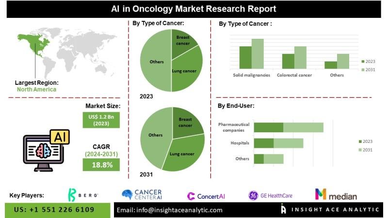 InsightAce Analytic Pvt. Ltd. announces the release of a market assessment report on the “Global AI in Oncology Market- (Type of Cancer (Solid malignancies, Breast cancer, Lung cancer, Prostate cancer, Colorectal cancer, Brain tumor, Others), By End User (Hospitals, Pharmaceutical companies, Research Institutes, Others)), By Region, Trends, Industry Competition Analysis, Revenue and Forecast To 2031.”