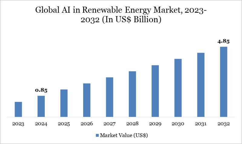 According to DataM Intelligence, the global AI in Renewable Energy market reached US$ 0.85 billion in 2024 and is expected to reach US$ 4.85 billion by 2032, growing at a CAGR of 24.32% during the forecast period 2025-2032. This growth is propelled by the rapid integration of AI for smart grid management and demand forecasting, increasing renewable energy penetration requiring advanced predictive maintenance and optimization, rising adoption of cloud-based AI solutions for scalability, strong demand in energy generation and transmission for robotics and safety applications, and accelerating digital transformation across utilities worldwide.