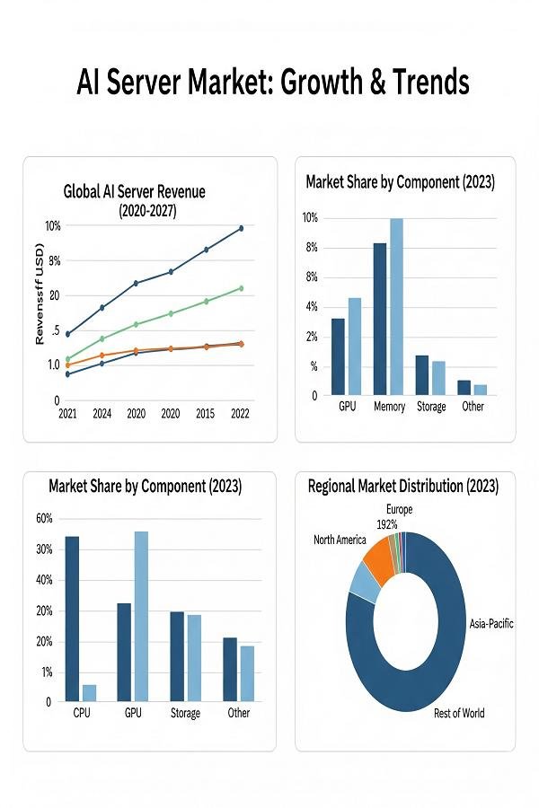 The AI server market consists of high-performance computing systems optimized for artificial intelligence training, inference, and data-intensive workloads. These servers integrate advanced CPUs, GPUs, TPUs, and accelerators, often supported by liquid cooling, high-speed interconnects, and large memory bandwidths. They are critical for supporting generative AI, deep learning, natural language processing, computer vision, and big data analytics. Data centers and cloud providers dominate deployment, but industries such as healthcare, finance, automotive, and manufacturing are adopting AI servers for specialized workloads like drug discovery, fraud detection, and autonomous driving. North America currently leads due to hyperscale investments, while Asia-Pacific is the fastest-growing region driven by national AI initiatives and local manufacturing capacity. Despite high costs, energy demands, and rapid hardware cycles, opportunities exist in edge AI, leasing models, and custom hardware. AI servers are the backbone of the global AI ecosystem.