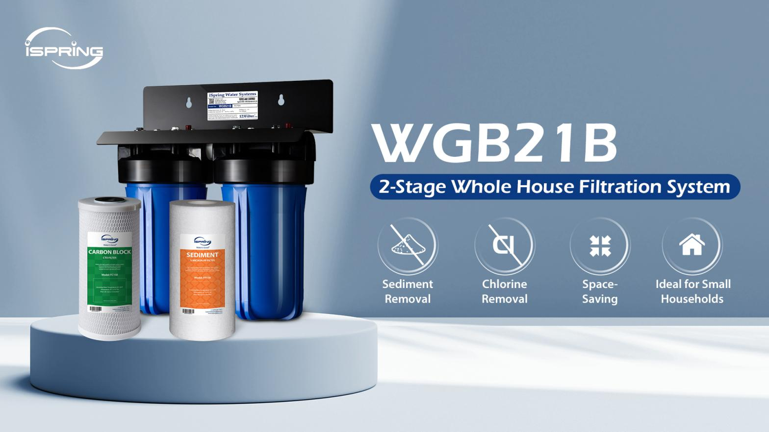 - WGB21B: A compact 2-stage whole house water filtration system designed for small homes or apartments. Effectively reduces sediment, chlorine, rust, and odors to deliver cleaner water at every tap. Features a durable stainless steel frame and easy installation.