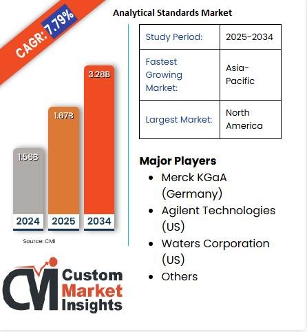According to Custom Market Insights (CMI), The Global Analytical Standards Market presented a growth of USD $1.56 Billion by 2024 to $1.67 Billion in 2025 and is estimated to touch USD $3.28 Billion by the end of 2034 at a compound annual growth rate (CAGR) of approximately 7.79% during the projected period 2025-2034.