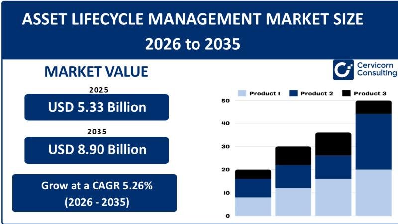 According to the Cervicorn Consulting report, the global Asset Lifecycle Management market was valued at approximately USD 5.33 billion in 2025 and is projected to reach around USD 8.90 billion by 2035, expanding at a compound annual growth rate (CAGR) of 5.26% during the forecast period 2026-2035.