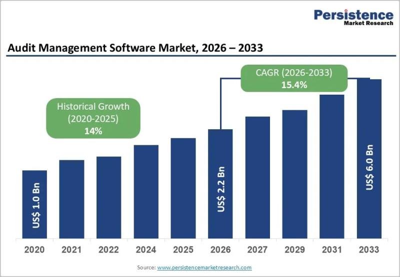 The global audit management software market is likely to be valued at US$ 2.2 billion in 2026 and is projected to reach US$ 6.0 billion by 2033, expanding at a robust CAGR of 15.4% during the forecast period 2026-2033. This strong growth reflects rising regulatory complexity, increasing demand for real-time and continuous auditing, and rapid adoption of cloud-based audit platforms. Enterprises across BFSI, healthcare, manufacturing, energy, and government sectors are increasingly prioritizing automated audit solutions to strengthen risk oversight and operational resilience.