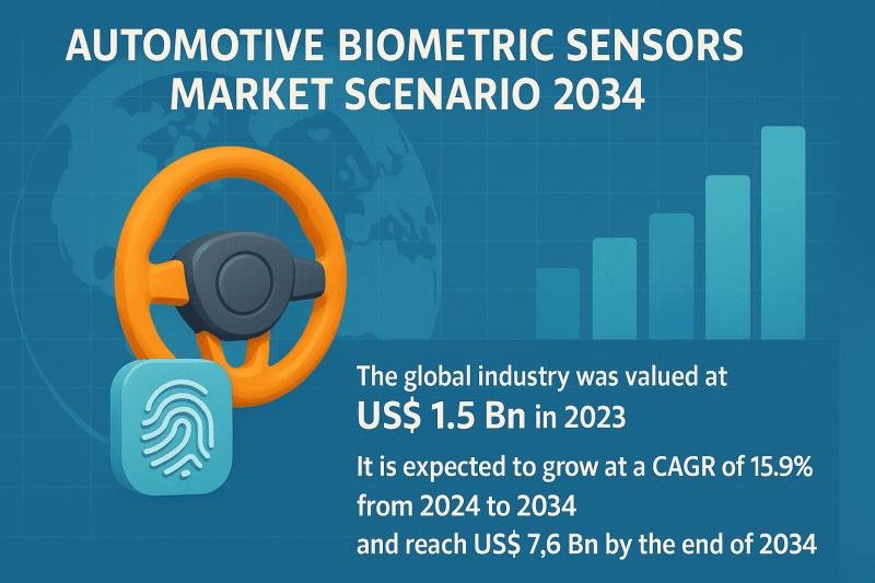 The global automotive biometric sensors market was valued at US$ 1.5 Billion in 2023 and is expected to reach US$ 7.6 Billion by 2034, growing at a strong CAGR of 15.9% from 2024 to 2034. Rising demand for advanced in-vehicle security and personalization features is propelling market growth. Biometric technologies such as fingerprint recognition, facial detection, and iris scanning are increasingly being integrated for secure access and driver monitoring. The surge in connected and autonomous vehicles is further accelerating the adoption of biometric sensor solutions.