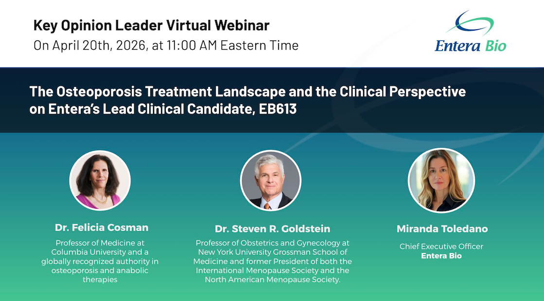 In a virtual Key Opinion Leader (KOL) roundtable hosted today, Entera Bio (Nasdaq: ENTX) convened globally recognized authorities in osteoporosis and women’s health to discuss the current osteoporosis treatment landscape and the opportunity for its lead clinical candidate, EB613 – being developed as the first and only oral anabolic (bone-forming) tablet for osteoporosis.