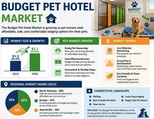 The Budget Pet Hotel Market refers to affordable pet boarding and accommodation services that provide temporary housing, feeding, grooming, and basic care services for pets such as dogs, cats, and small animals at lower prices compared to premium pet hotels. Budget pet hotels are designed for pet owners who need short-term or long-term boarding services while traveling, relocating, or during emergencies. These facilities provide essential pet care services such as sleeping areas, feeding schedules, exercise time, basic grooming, and health monitoring. The market includes pet boarding facilities, pet daycare centers, kennel services, and pet care service providers offering low-cost accommodation options. The increasing number of pet owners, rising travel frequency, and growing demand for pet care services are driving the growth of this market.
