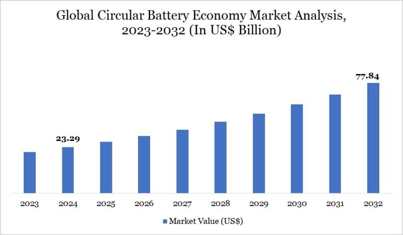 The Circular Battery Economy Market reached US$ 23.29 billion in 2024 and is projected to reach US$ 77.84 billion by 2032, growing at a CAGR of 16.28% during the forecast period 2025 to 2032.