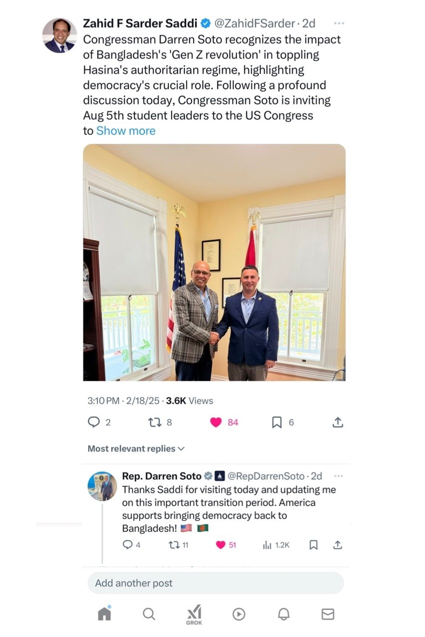 In a tweet following the meeting, Congressman Soto conveyed his appreciation to Zahid F Sarder Saddi for the visit and for providing crucial updates on the democratic transition in Bangladesh. He reiterated America’s support for the restoration of democracy in the South Asian nation, emphasizing the importance of upholding human rights and governance principles.