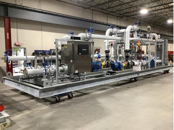 Standard system components include process and circulation pumps with Variable Frequency Drives (VFDs), heat exchangers (plate & frame or shell & tube configurations), expansion and buffer tanks, inline filtration units, temperature and pressure transmitters, control and isolation valves, flowmeters, air release assemblies, and stainless steel or carbon steel piping systems.