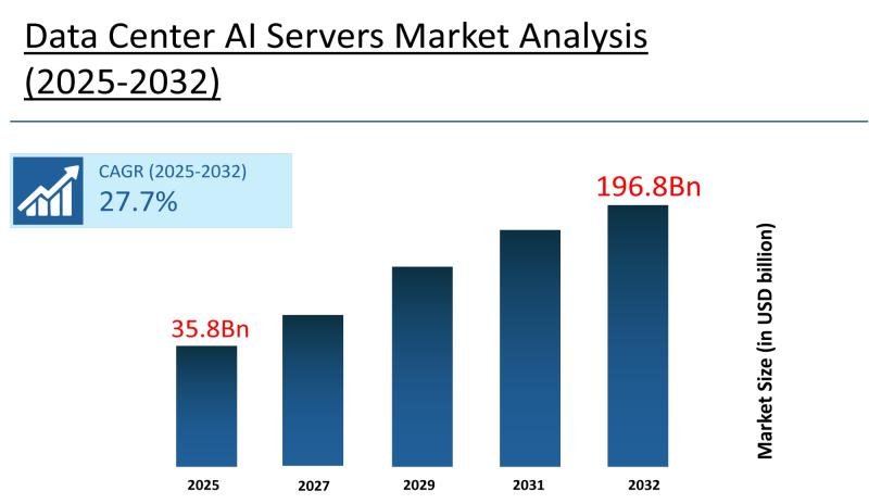 The global data center AI servers market was valued at US$ 35.8 billion in 2025 and is projected to reach approximately US$ 196.8 billion by 2032, growing at a CAGR of 27.7%. This growth is driven by widespread enterprise AI adoption, generative AI infrastructure buildout by cloud providers, and large-scale data center expansion programs across North America and Asia-Pacific.