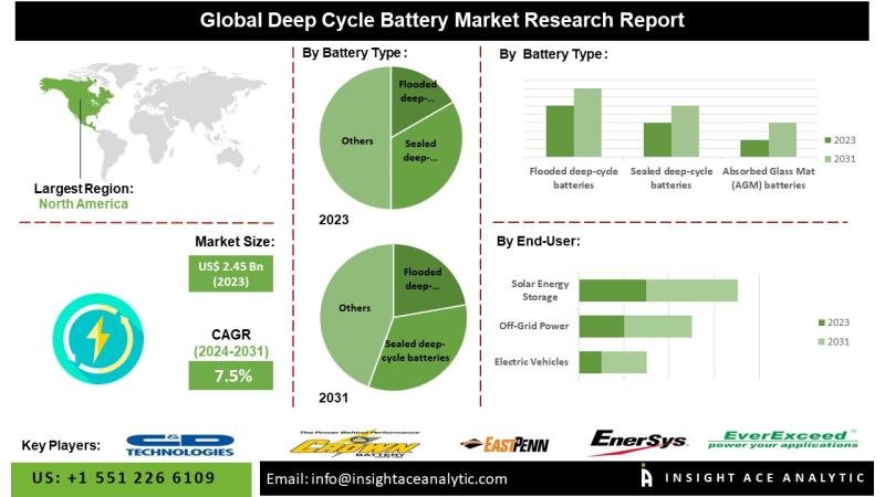 InsightAce Analytic Pvt. Ltd. announces the release of a market assessment report on the “Global Deep Cycle Batteries Market – (By Battery Type (Flooded deep-cycle batteries, Sealed deep-cycle batteries, and Lithium-ion batteries), By Application (Solar Energy Storage, Off-Grid Power, Electric Vehicles, Marine Equipment, Telecom Backup, and Others)), Trends, Industry Competition Analysis, Revenue and Forecast To 2031.”