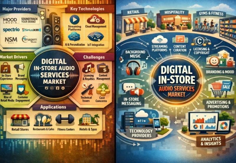 Definition: The Digital In-Store Audio Services Market encompasses cloud-based and managed audio solutions designed to deliver music, announcements, promotions, and branded messaging within physical retail and commercial spaces. These services include content licensing, playlist curation, scheduling software, AI-driven audience targeting, and integration with point-of-sale or customer analytics systems. Retailers, hospitality venues, shopping malls, and corporate offices use digital in-store audio to enhance customer experience, reinforce brand identity, and influence purchasing behavior. Market growth is driven by omnichannel retail strategies, demand for personalized in-store engagement, and advancements in digital signage and audio streaming technologies. Compliance with music licensing regulations and seamless multi-location management are critical competitive factors in this market.