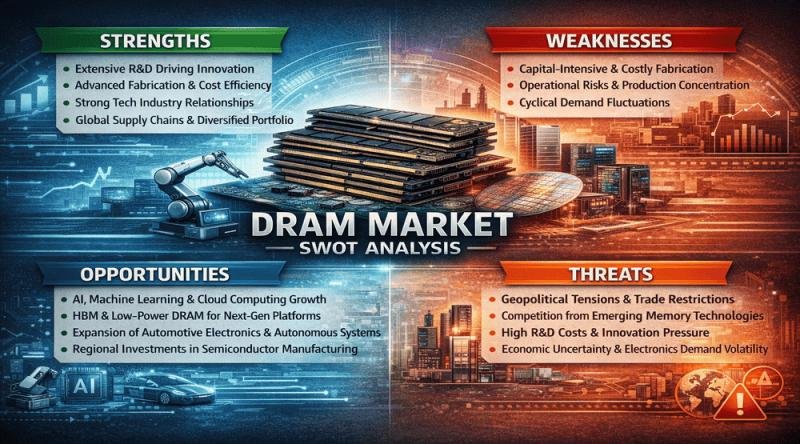 Major DRAM producers have strengthened collaborations with GPU and AI processor manufacturers to develop optimized memory architectures capable of handling large-scale data processing workloads. In addition, several companies have announced investments in advanced semiconductor fabrication facilities aimed at improving supply chain resilience and supporting future demand for memory technologies.