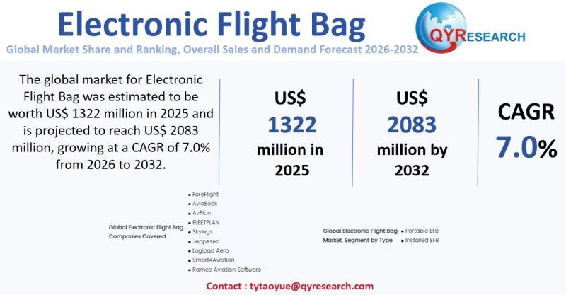 The global market for Electronic Flight Bag was estimated to be worth US$ 1322 million in 2025 and is projected to reach US$ 2083 million, growing at a CAGR of 7.0% from 2026 to 2032.