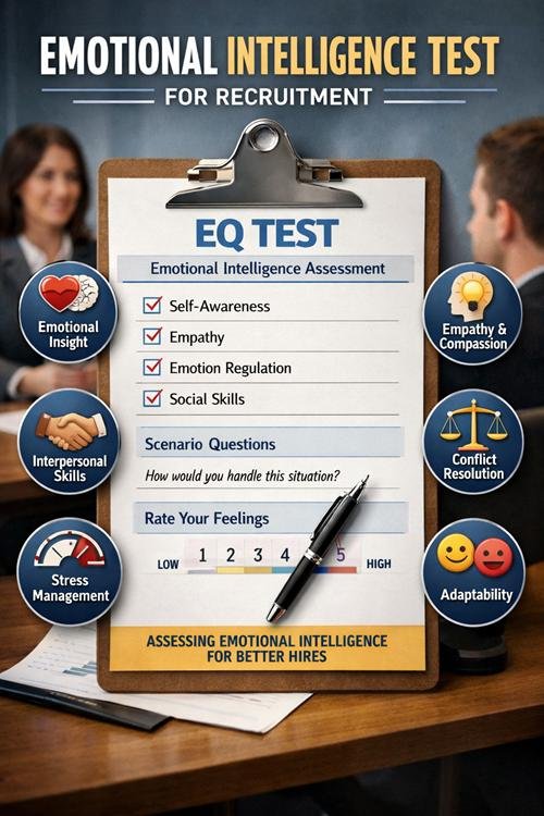 Emotional Intelligence Test for Recruitment is an assessment tool used by employers to evaluate a candidate’s ability to recognize, understand, manage, and influence emotions in themselves and others. It measures skills such as empathy, self-awareness, adaptability, relationship management, and stress handling to predict workplace behavior, teamwork, leadership potential, and overall job performance effectiveness.