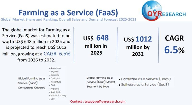 The global market for Farming as a Service (FaaS) was estimated to be worth US$ 648 million in 2025 and is projected to reach US$ 1012 million, growing at a CAGR of 6.5% from 2026 to 2032.