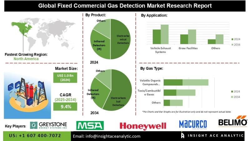 InsightAce Analytic Pvt. Ltd. announces the release of a market assessment report on the “Global Fixed Commercial Gas Detection Product Market Size, Share & Trends Analysis Report, By Gas Type (Toxic/Combustible Gases, Oxygen (O2), Volatile Organic Compounds (VOCs), and Others), By Product (Electrochemical Detectors, Catalytic Bead Detectors, Infrared Detectors (IR), and Others), By Application (Boiler Rooms, Vehicle Exhaust Systems, Data Centers, Grow Facilities, Cold Storage Facilities, Battery Storage & Charging Rooms, and Others),-Market Outlook And Industry Analysis 2034”