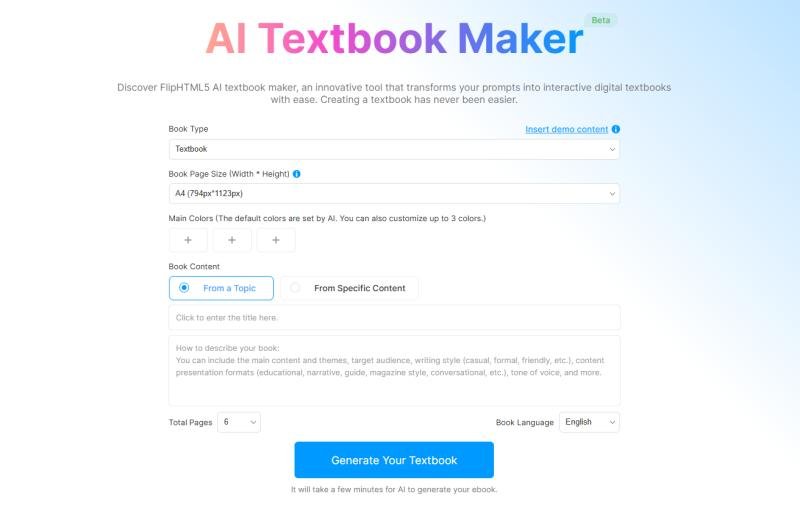 FlipHTML5 offers two flexible input modes to accommodate different user preferences: one allows users to upload structured markdown content, while the other involves providing a title, a brief description of the desired content, a preferred language, and the number of pages. With this information, it generates a complete textbook tailored to the user’s specifications.