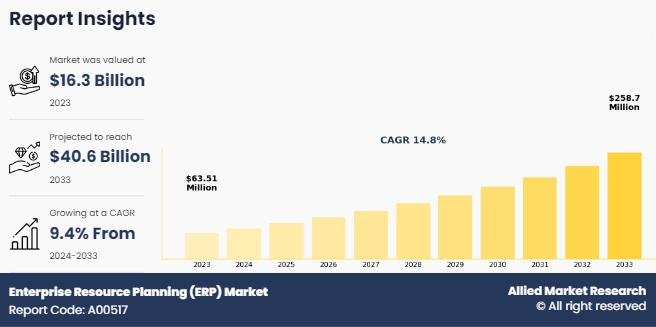 The global ERP market size was valued at USD 16.3 billion in 2023 and is projected to reach USD 40.6 billion by 2033, growing at a CAGR of 9.4% from 2024 to 2033.