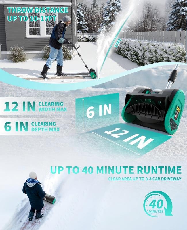 Its 20V motor and 4.0Ah battery provide up to 30 minutes of continuous runtime, clearing 12 inches wide and 6 inches deep per pass. Ideal for stairs, decks, sidewalks, and narrow paths, the GarveeSnowBlower keeps winter chores simple with its dual safety switches, fast assembly, and compact storage-friendly design.
