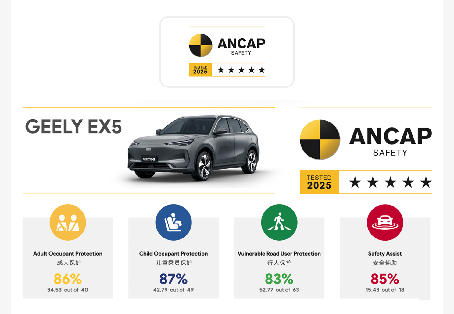 Building on its triumph in the 50km/h frontal center pole impact test, the Geely Galaxy E5 has further cemented its safety credentials by securing the prestigious “Global Dual Five-Star” safety certification. This remarkable achievement distinguishes it as the sole A-class Chinese-brand pure electric SUV to garner both Euro NCAP and ANCAP “Five-Star” safety ratings, underscoring its globally acclaimed safety performance as recognized by authoritative institutions worldwide.