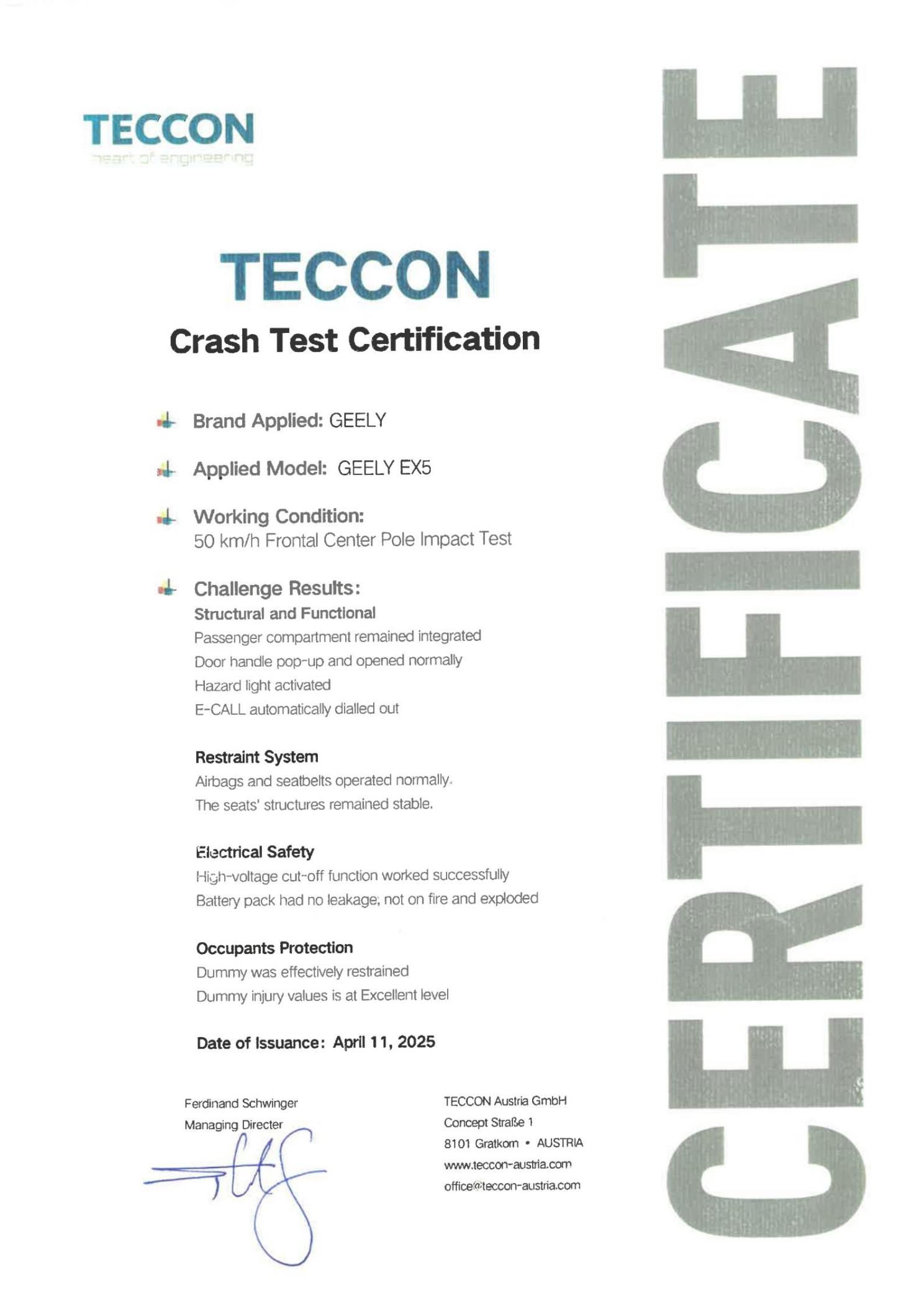 On April 16, the Shendun Battery Safety System, a leader in new energy vehicle (NEV) safety, demonstrated its prowess once again: The Geely Galaxy E5 successfully completed a 50km/h frontal center pole impact test at the TECCON Laboratory in Austria, a facility accredited by Euro NCAP. This achievement further validates the E5’s “Dual Five-Star” safety ratings from both Euro NCAP and ANCAP, cementing its reputation for unparalleled safety. Building on a series of ultra-rigorous, ultra-high-standard safety trials, the Shendun Battery Safety System has once again set a new benchmark in NEV safety, solidifying its position as the most secure vehicle protection system available.
