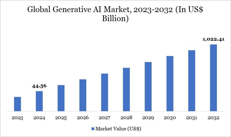 According to DataM Intelligence, the generative AI market reached US$ 45.56 billion in 2024 and is expected to reach US$ 1,022.41 billion by 2032, growing at an exceptional CAGR of 47.53% during the forecast period 2025-2032. Growth is driven by accelerating enterprise adoption of generative AI across business functions, rising demand for AI chatbots and agents, advances in large language models (LLMs), and increasing integration of generative AI into internal systems and external communication channels.