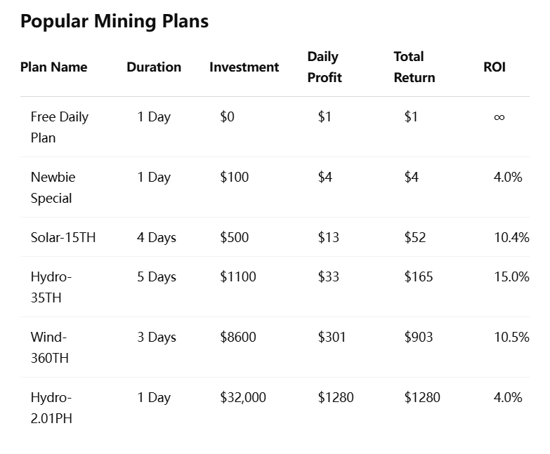 Choose from short- or mid-term mining plans starting at just 1 day to match your income goals. - Daily Profits, Withdraw Anytime