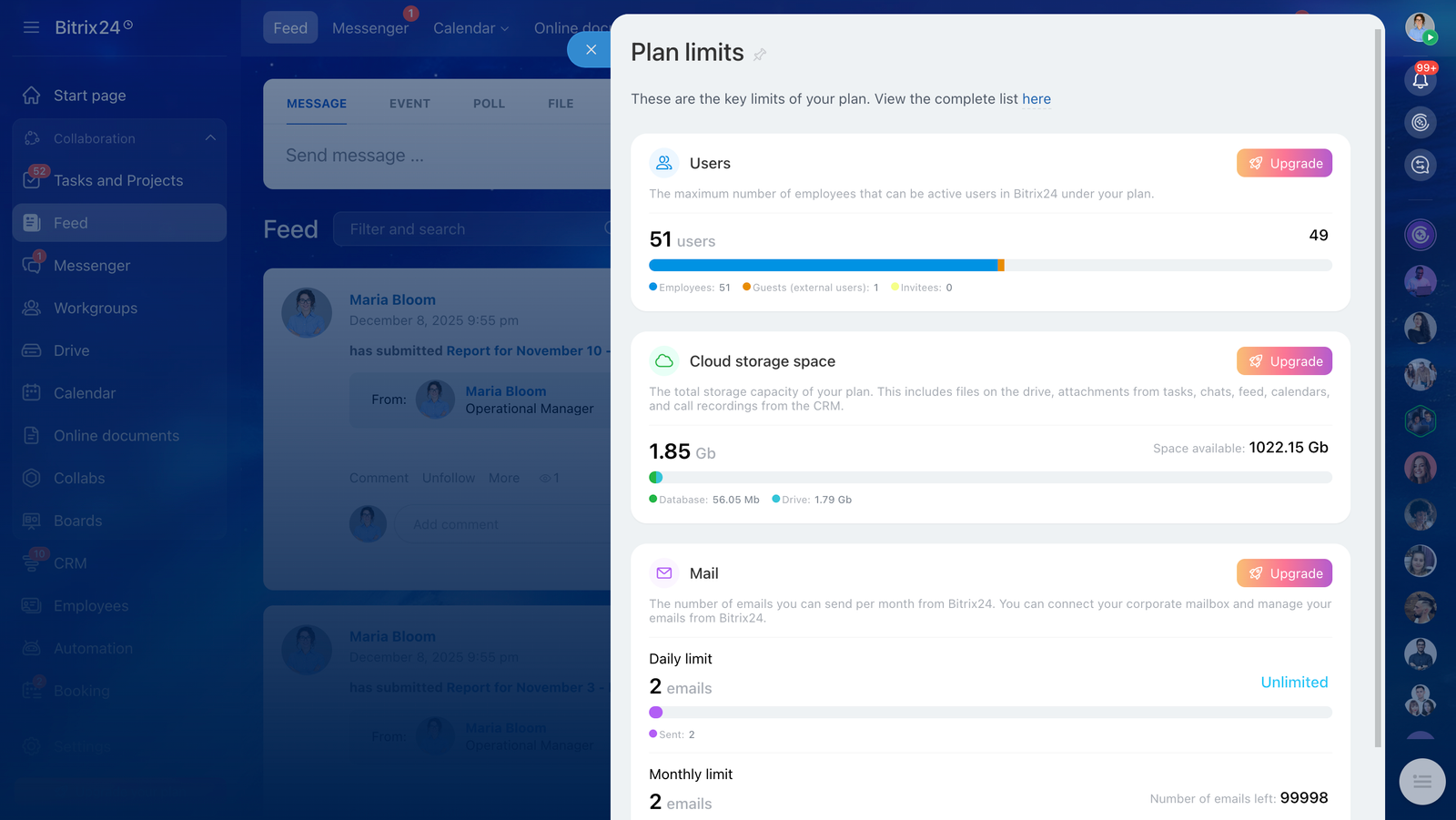 Unexpected system limits can slow down a business. Emails might not reach clients, files could fail to upload, or storage could run out at the worst possible moment. These disruptions cost time, focus, and momentum. Bitrix24’s updated Subscription section gives administrators an instant view of storage, email usage, user access, and plan details, so potential issues can be spotted and handled before they affect daily operations.