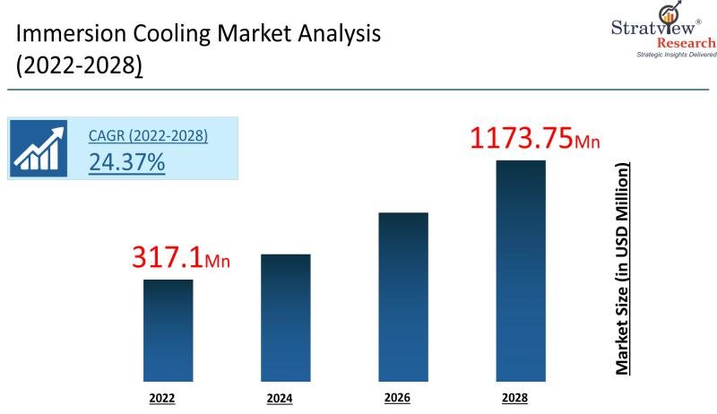 The Immersion Cooling Market – involving advanced liquid-based cooling systems where electronic components are submerged in thermally conductive, non-conductive fluids to dissipate heat – is witnessing rapid growth as industries tackle rising data processing demands and dense computing environments. Stratview Research estimates that the market, valued at USD 317.1 million in 2022, is likely to reach USD 1,173.75 million by 2028, growing at a CAGR of 24.37% during the forecast period of 2022 – 2028. The primary driver of this expansion is the escalating number of data centers globally, where immersion cooling’s superior thermal management efficiently addresses high heat loads from high-density computing.