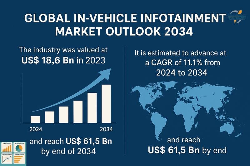 The global in-vehicle infotainment market was valued at US$ 18.6 Bn in 2023 and is expected to reach US$ 61.5 Bn by 2034, growing at a CAGR of 11.1% from 2024 to 2034. This growth is driven by increasing demand for advanced integrated head units, heads-up displays, and high-performance DSPs and GPUs. Connectivity features such as GPS, Wi-Fi, and Bluetooth are becoming standard, enhancing the overall driving experience. Additionally, innovations in operating systems and sensor technologies are propelling the market forward.