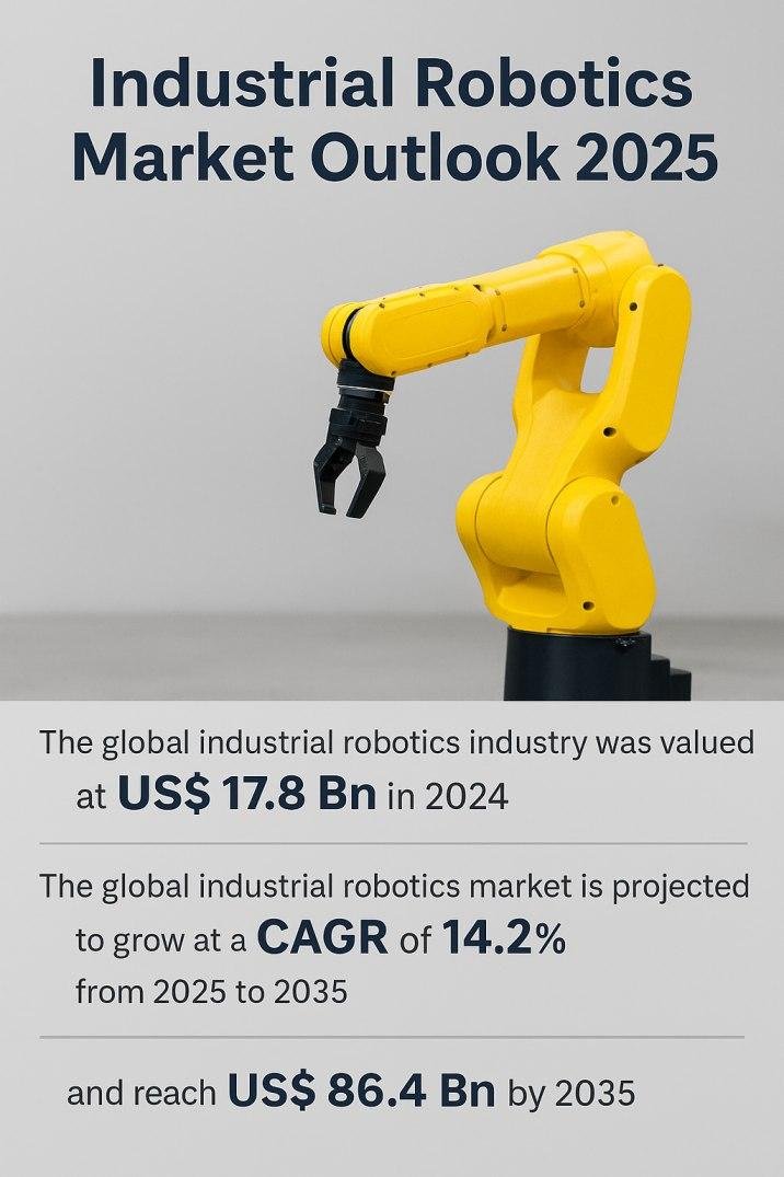 The global industrial robotics industry is positioned for strong advancement as companies around the world adapt to rapidly changing manufacturing dynamics. In 2024, the market achieved a valuation of US$ 17.8 billion, reflecting the ongoing push toward automated production and intelligent industrial operations. Moving forward, the market is projected to expand at a remarkable CAGR of 14.2% from 2025 to 2035, reaching US$ 86.4 billion by 2035. This robust growth underscores the increasing reliance on robotics to compensate for labor shortages, enhance safety and precision, and optimize output across manufacturing, logistics, food processing, pharmaceuticals, and more. As digital transformation and Industry 4.0 accelerate, industrial robotics will remain central to global competitiveness, driving operational efficiency and cost-effectiveness across business ecosystems.